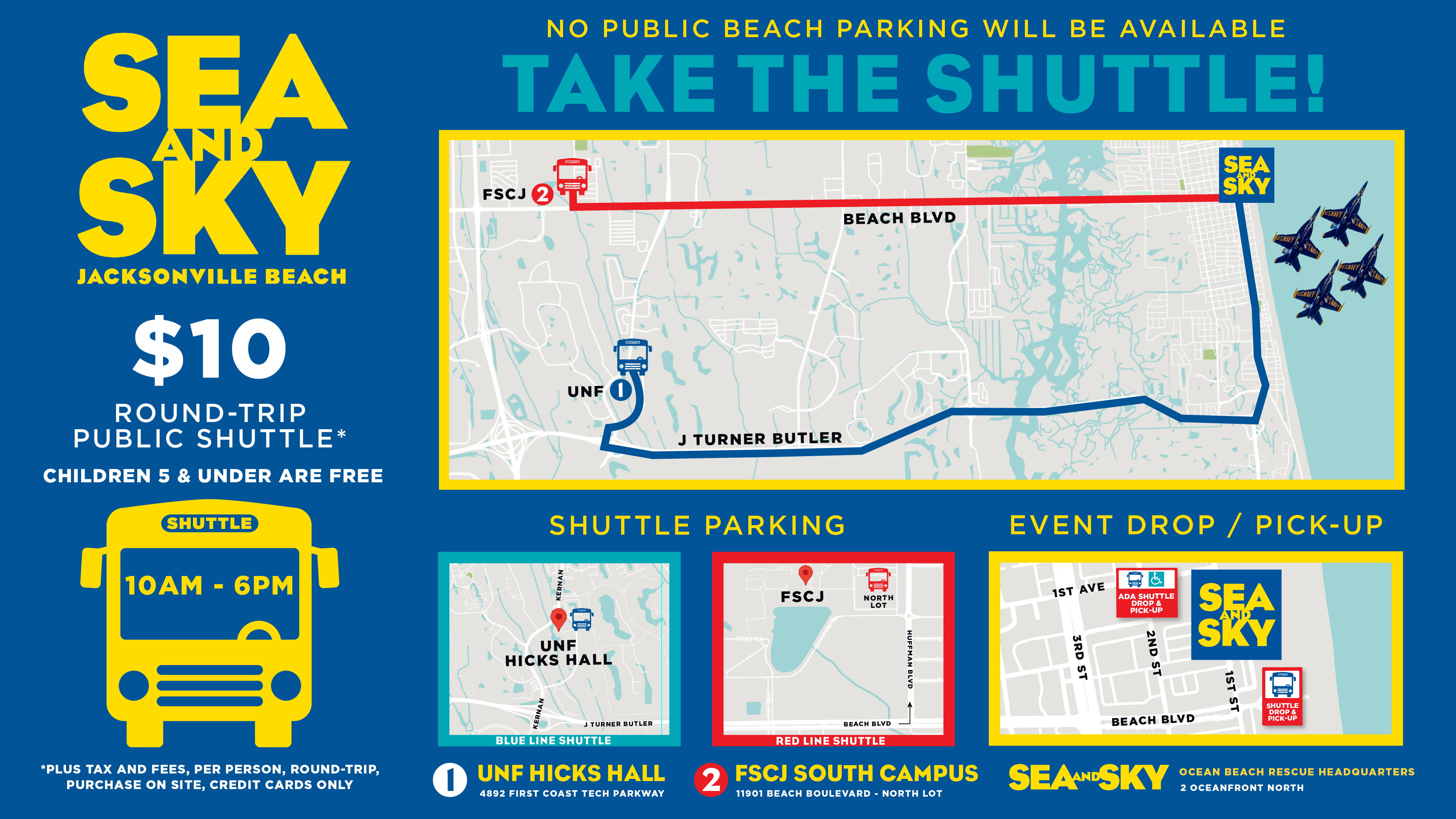 Make your trip to the 2025 Sea & Sky Air Show in Jacksonville Beach simple and stress-free with our official shuttle service. With limited parking at Jacksonville Beach during the event, the official Sea & Sky Shuttle is the easiest way to get to the show.